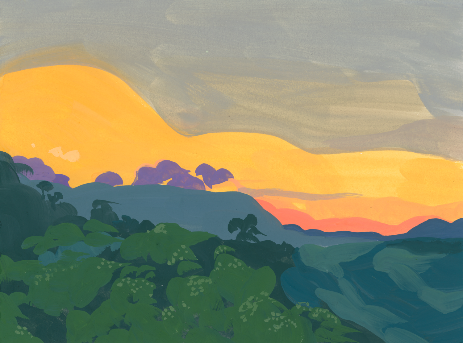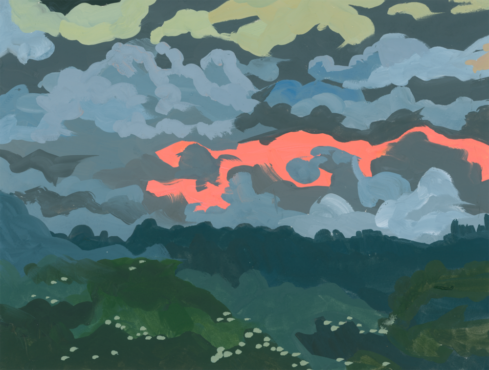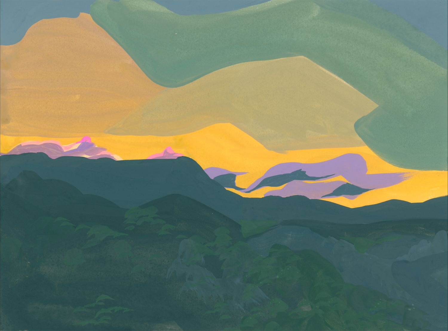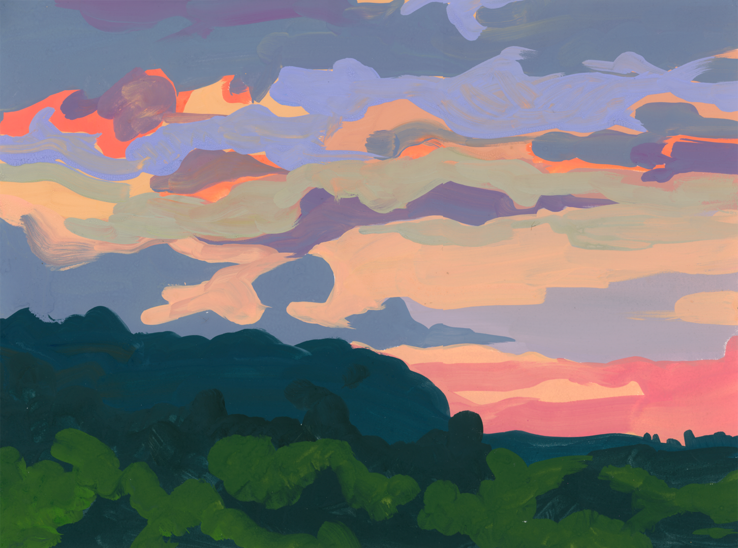 We sprout and return from the earth. Ori’s landscapes are painted in plein air (on site) through a mental technique they call organic camera. The goal is to elucidate the relationship between a person and a space through paintings. For these, Ori would select a specific, fixed location and paint a sunset from the same spot at the same time over many days.