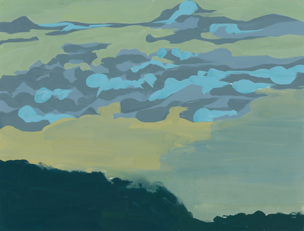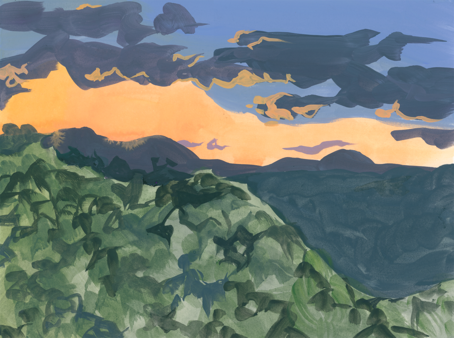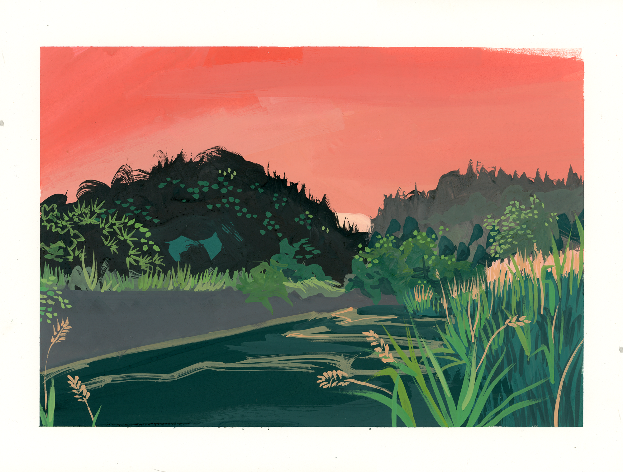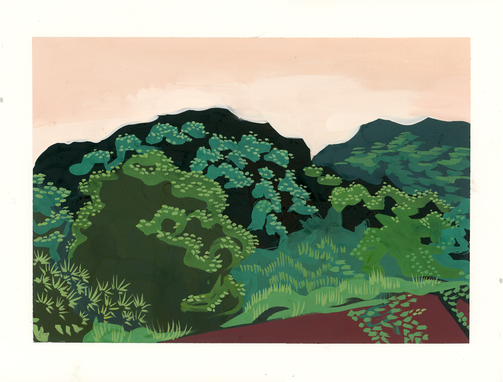 We sprout and return from the earth. Ori’s landscapes are painted in plein air (on site) through a mental technique they call organic camera. The goal is to elucidate the relationship between a person and a space through paintings. For these, Ori would select a specific, fixed location and paint a sunset from the same spot at the same time over many days.